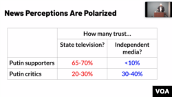 Независимые, критические настроенные СМИ, сосредоточенные на сложных и неприятных темах, будь то фальсификация выборов, жестокость полиции, притеснения меньшинств или коррупция Путина, кажутся этой аудитории - враждебными.